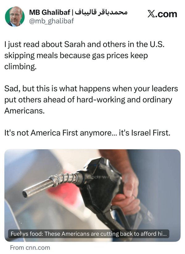 @Lin_khojoon18 ساعت پیشدر پاسخ بهجالبه مردم ایران هم خیلی ساله خیلی چیزها رو از سفره شون حذف کردن . شاید به گفته اقای قالیباف مسولان ما هم اول ایران رو توی اولویت نزاشتن که اینجوری شده و تورم مون سه رقمی شده