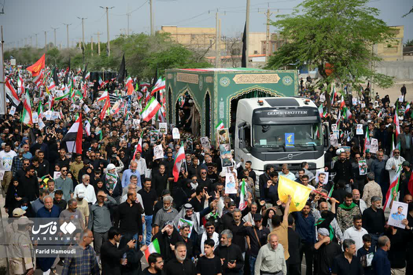 امروز در میان شعارهای مردم، صدایی واحد در خیابان‌ها می‌پیچید: «دست خدا بر سر ما، خامنه‌ای رهبر ما» و اندکی بعد جمعیت با فریادی دیگر و هم‌صدا پاسخ می‌داد: «انتقام، انتقام.» مردم خون‌خواه رهبر شهیدشان هستند و هر بار که به میدان بیایند، این خون‌خواهی را تکرار می‌کنند. خیابان‌های آبادان امروز رنگ و بوی اربعین حسینی هم داشت. موج مردمی پرچم‌های عزای حسین را نیز برافراشته بودند. گویی آبادانی‌ها، بدرقه فرمانده دریا را به آیینی از جنس وفاداری و عهد با آرمان‌های عاشورایی تبدیل کرده بودند.  در گوشه‌ای از مسیر تشییع، دختران آبادانی با لباس‌های رزم ایستاده بودند. دخترانی که در این صبح جنوبی، بازهم یک پیام مهم به جهان مخابره کردند: روح مقاومت در کالبد زنان تا همیشه زنده است و مبارزه با دشمنان زن و مرد نمی‌شناسند.