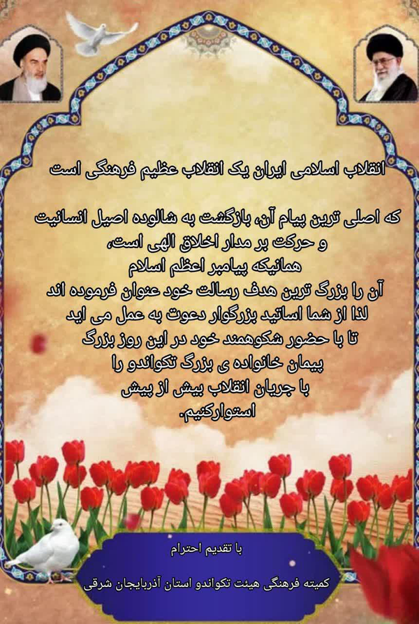 به گزارش خبرگزاری فارس از تبریز، تکواندوکاران، مربیان، داوران و خانواده بزرگ تکواندو استان آذربایجان‌شرقی با حضوری پرشور و منسجم در راهپیمایی یوم‌الله ۲۲ بهمن، بار دیگر وفاداری خود را به آرمان‌های والای انقلاب اسلامی و فرامین رهبر معظم انقلاب اسلامی اعلام می کنند.این حضور باشکوه، جلوه‌ای از وحدت، بصیرت و روحیه انقلابی جامعه ورزش مخصوصآ تمامی تکواندو کاران استان که همواره در کنار مردم و در مسیر تحقق ارزش‌های اسلامی و ملی گام برمی‌دارند.تکواندوکاران استان آذربایجان‌شرقی با این حرکت ارزشمند، ضمن گرامیداشت یاد و خاطره شهدای والامقام انقلاب اسلامی، دفاع مقدس و شهدای امنیت، بر ادامه راه شهیدان و تبعیت از منویات مقام معظم رهبری تأکید خواهند نمود.بی‌شک این حماسه حضور، برگ زرینی دیگر در کارنامه افتخارات جامعه ورزشی استان و نمادی از تعهد، مسئولیت‌پذیری و ولایت‌مداری تکواندوکاران دیار ستارخان، باقرخان و باکری ها خواهد بود.
